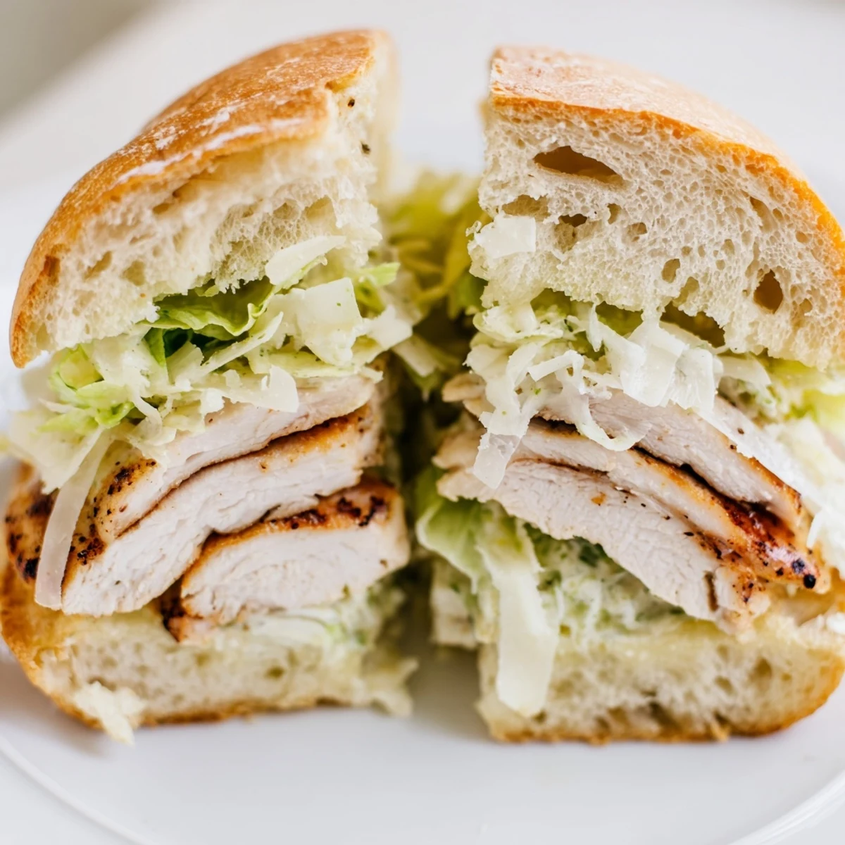 This hearty handheld combines tender grilled chicken breasts seasoned with garlic and pepper, topped with a rich homemade Caesar dressing featuring mayonnaise, Parmesan, lemon, and Worcestershire. Crisp shredded romaine, additional shaved Parmesan, and optional cherry tomatoes layer between butter-toasted ciabatta rolls for crunch. The entire meal comes together in just 30 minutes, making it perfect for lunch or dinner when you want something satisfying but don't want to spend hours at the stove.