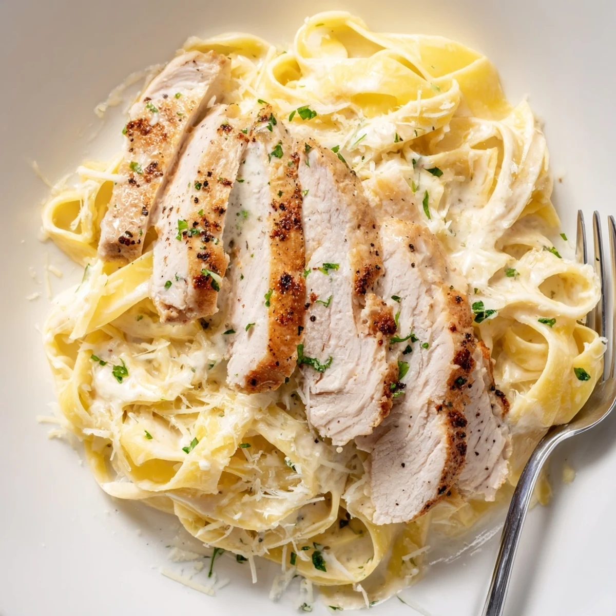 Start by cooking pasta until just al dente and reserve some starchy pasta water. Season and sear chicken breasts until golden, then let rest while you soften onion and garlic in the skillet. Deglaze with chicken broth, stir in cream and Parmesan until smooth, then return sliced chicken and toss with pasta, using reserved water to adjust sauce. Finish with chopped parsley and serve immediately.