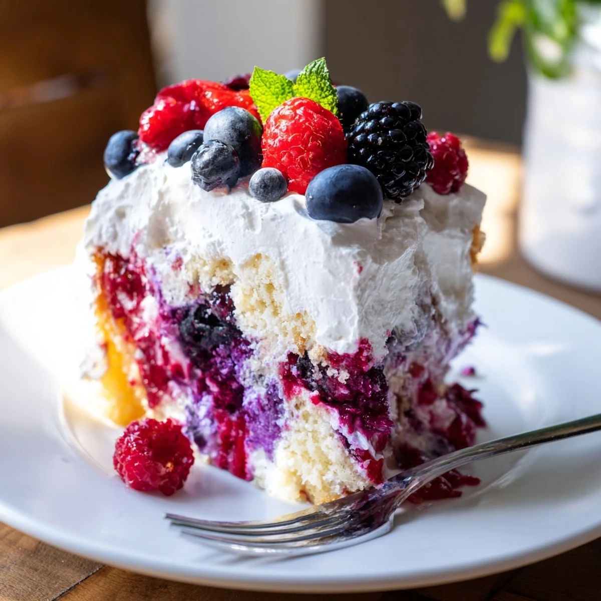 This luscious vanilla cake transforms into an irresistible summer dessert when infused with a vibrant mixed berry sauce. The cake is poked with holes to allow the sweet, tart berry mixture to seep deep into every layer, creating pockets of fruity flavor throughout.